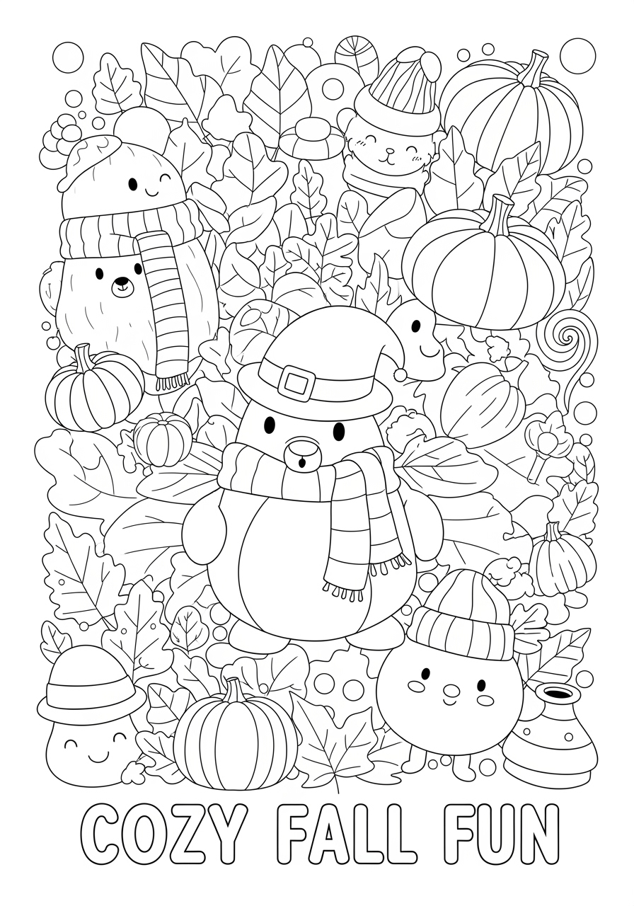 Welcome the vibrant season of autumn with our delightful "Autumn Joy" coloring page, perfect for young children. This charming scene brings the joy of fall to life with a friendly scarecrow, complete with large eyes and a big smile, inviting preschoolers to explore their creativity. Set against an autumn farm backdrop, little ones will enjoy coloring the simple wooden fence and the lively pumpkin patch, brimming with pumpkins of all shapes and sizes intertwined with twisting vines. As they color, they’ll delight in the playful addition of falling leaves from maple, oak, and birch trees, and the cheerful acorn with rosy cheeks. This coloring page is a splendid way to encourage relaxation and fine motor skill development, making it ideal for classroom activities or cozy home crafts. Our free printable fall coloring pages for preschoolers offer a joyful and imaginative experience, creating moments of bonding and a sense of accomplishment for your little artists. Download this page today and let the creativity flow as your preschoolers embark on an autumn adventure through colors.