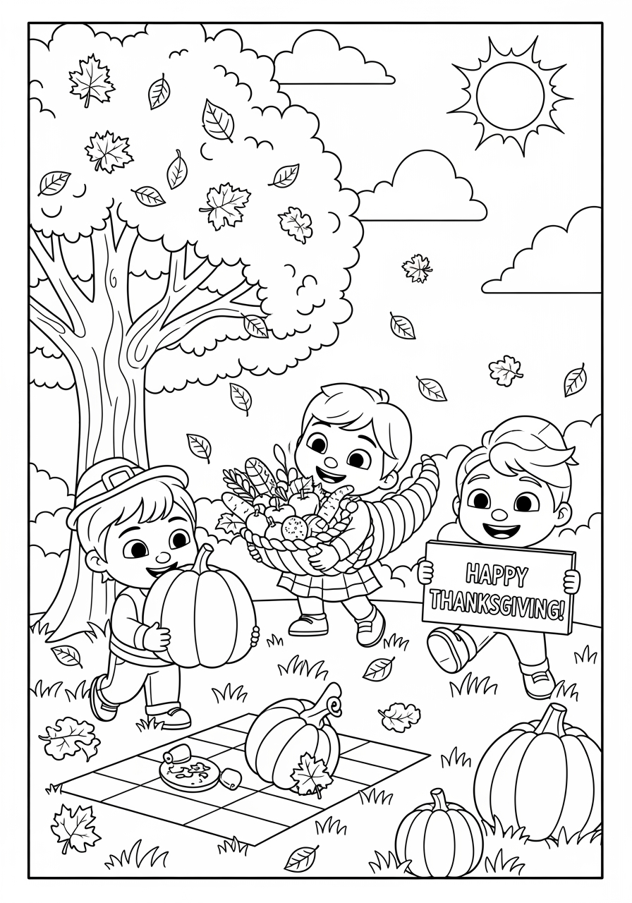 Introduce your little ones to the festive spirit with our charming turkey coloring pic. This delightful illustration features a friendly turkey with a rounded body and plentiful, layered feathers, standing proudly at the center of the page. The design is rendered in crisp black and white line art, making it an ideal activity for developing fine motor skills and encouraging creativity. Perfect for classroom use, home crafts, or even a calming travel activity, this coloring page invites children to explore their imagination and enjoy some mindful coloring time. The playful "Gobble Gobble Day!" text at the top adds a cheerful note, while the autumn-themed background is adorned with cartoon-style pumpkins and foliage, enhancing the festive feel. This turkey coloring pic provides an excellent opportunity for children to relax and express themselves through art, promoting a sense of accomplishment and joy. Easily downloadable and printable, this coloring page is a must-have for parents and educators looking to enrich their holiday-themed activities.
