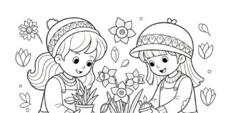 Kids Planting Daffodil Coloring Page
