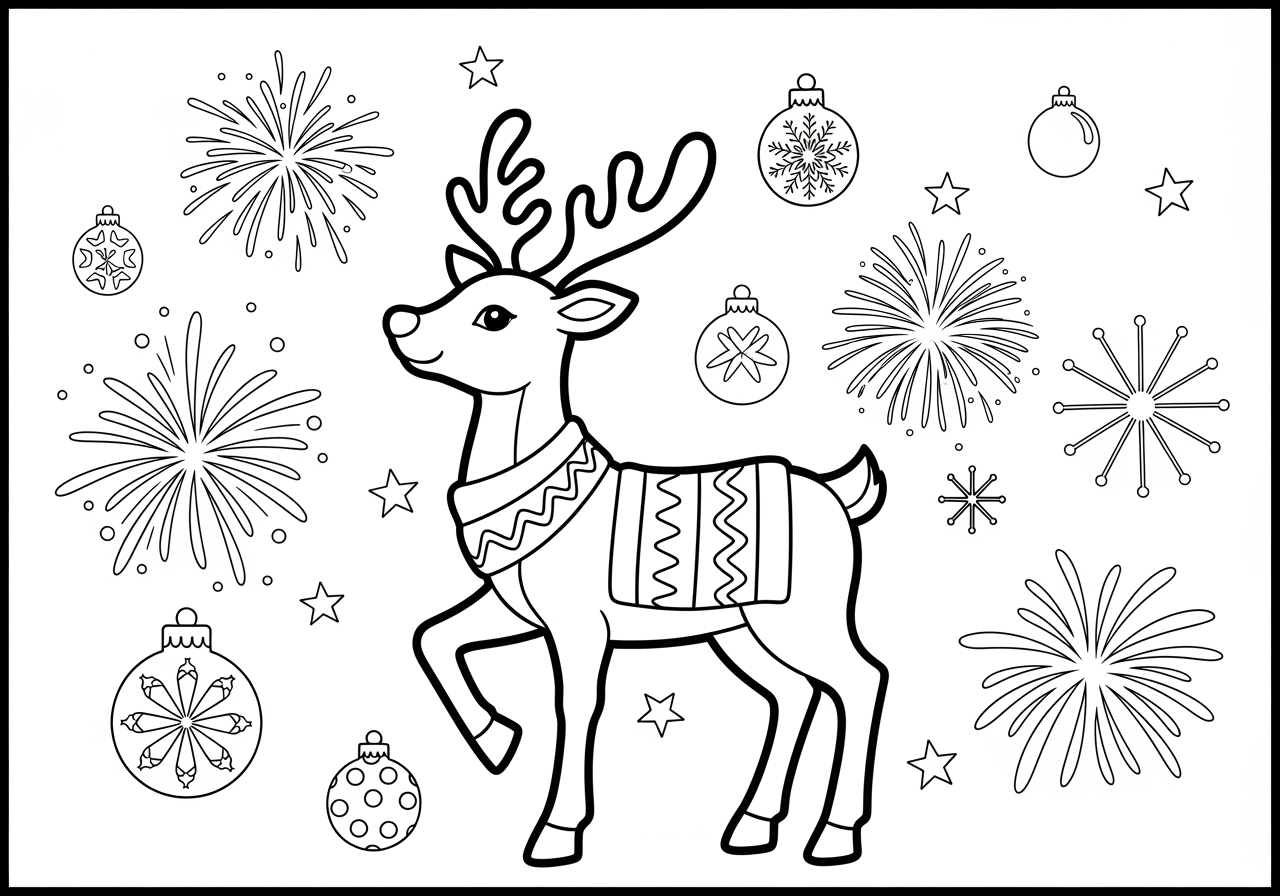 Unleash your child's creativity and holiday spirit with our delightful "Winter Wonderland Reindeer" coloring page. This charming Christmas-themed printable is perfect for nurturing creativity and developing fine motor skills. Featuring a whimsical reindeer adorned with large, curly antlers decorated with ornaments, this coloring page is designed to capture the magic of the season. With its friendly expression and striped scarf, the reindeer stands at the center, surrounded by beautifully decorated Christmas trees and snowflakes. The snow-draped ground adds to the festive atmosphere, making it a joy to color. Ideal for classrooms, home crafts, or as a mindful activity during holiday travels, this coloring page encourages relaxation and patience in children. Parents and educators alike will appreciate the simplicity and educational value of this black-and-white line art. Download and print this Christmas coloring picture that you can print to enjoy a joyful and imaginative holiday activity with your little ones, creating memories and a sense of accomplishment.