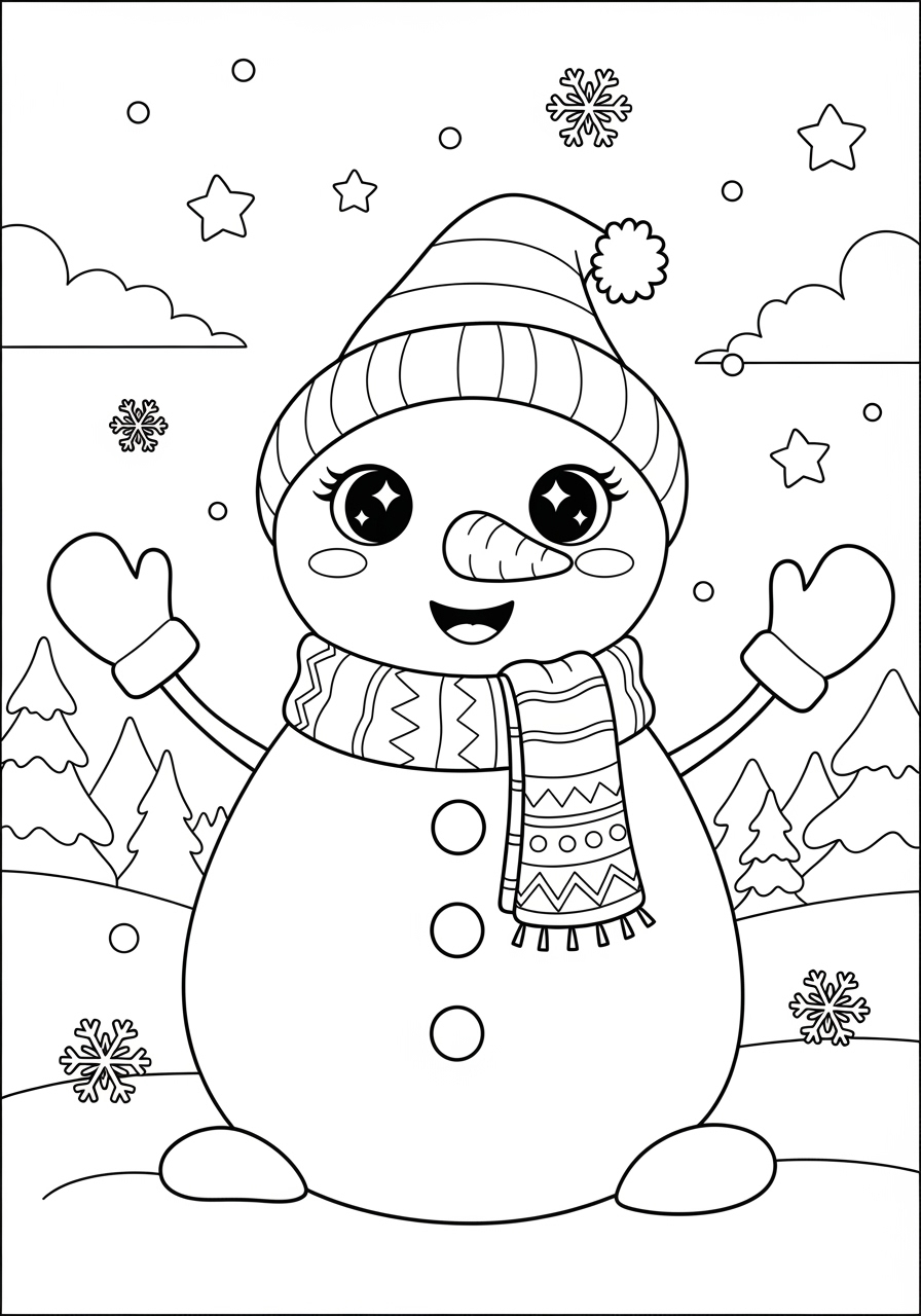 This delightful coloring page about Christmas is perfect for parents and educators seeking creative activities for children. It features a cheerful snowman with a tall top hat and a striped scarf, surrounded by wrapped gifts that boast swirls and stars patterns. The winter landscape background, complete with snow-covered pine trees and frosted branches, sets a festive scene that inspires imagination and joy. Large snowflakes and twinkling stars add a magical touch to the sky, while intricate festive ornaments like baubles and candies enhance the foreground. This coloring page offers a wonderful way for children to develop fine motor skills and patience, as they bring this charming image to life. Ideal for classroom use, home crafts, or even as a relaxing travel activity, this printable download encourages a sense of accomplishment and provides a joyful bonding experience. The bold outlines and large simple shapes make it easy for little hands to color within the lines, ensuring hours of fun and creativity during the holiday season.