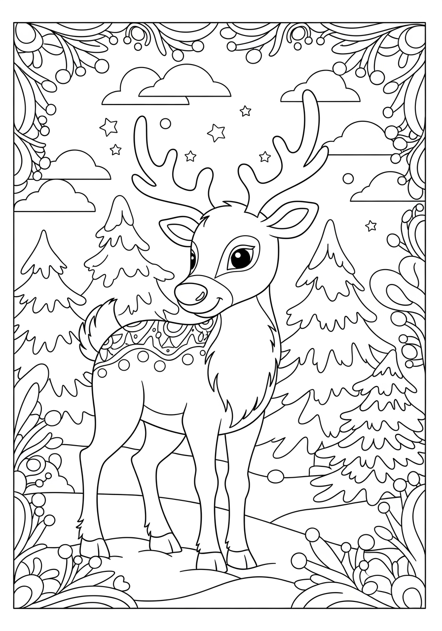 Welcome to a delightful world of festive creativity with our "Whimsical Christmas Celebration" coloring page! This charming design is perfect for young artists eager to explore the joy of the holiday season. Featuring a cheerful reindeer with a playful grin, this coloring page invites children to immerse themselves in a world of imagination and creativity. The reindeer, donning a Santa hat with holly leaves and berries, adds a touch of festive spirit, while its ornament-adorned antlers capture the essence of Christmas joy. Set against a snowy backdrop with gently falling snowflakes and twinkling stars, this scene is sure to captivate young minds. The foreground features a large gift box with a big bow, complemented by scattered Christmas baubles and candy canes. This layout encourages creativity and helps develop fine motor skills as children color within the bold outlines. Ideal for classroom activities, home crafts, or quiet moments of relaxation, this coloring page offers a wonderful opportunity for mindfulness and patience. Download this high-quality, printable coloring page and enjoy a bonding experience with your little ones as they bring this festive scene to life. Perfect for nurturing creativity and a sense of accomplishment, our "coloured christmas pictures to print" is a must-have for any holiday activity collection.