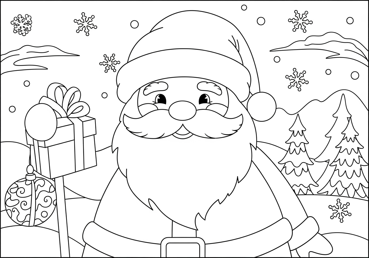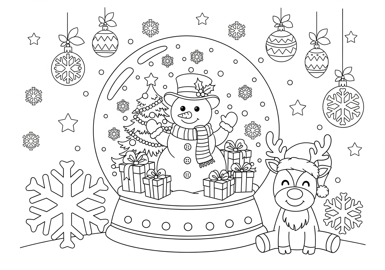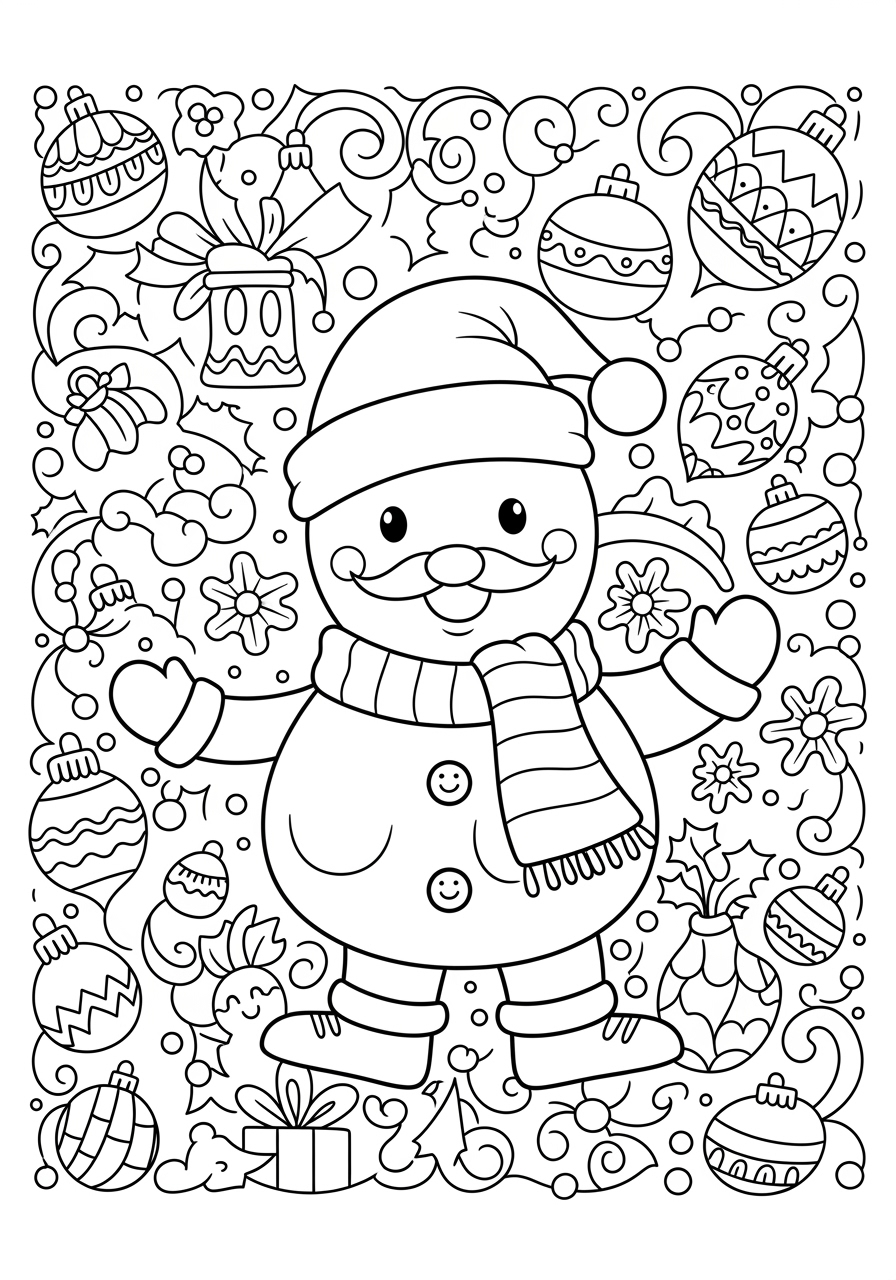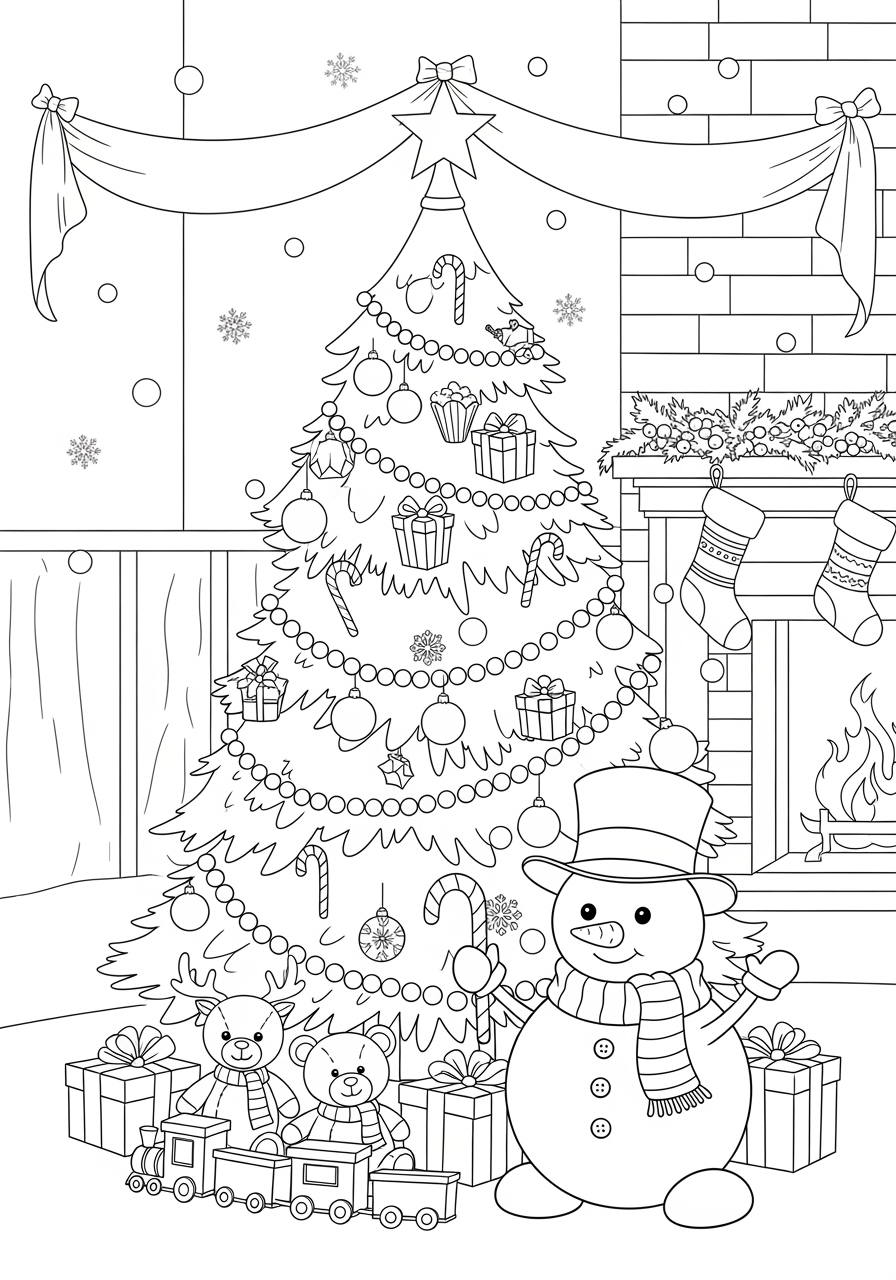 Bring the festive spirit to life with this delightful Xmas pic to colour, perfect for children eager to celebrate the holiday season with creativity and joy. This printable coloring page offers a detailed black-and-white line art illustration that features a large Christmas tree at its heart. Adorned with cheerful strings of popcorn and cranberries, candy canes, and intricate snowflakes, the tree is a delight to color. Surrounding the tree are small gifts, a charming toy train, and plush toys like a teddy bear and a reindeer, adding warmth and imagination to the scene. The friendly snowman in front, with his top hat and candy cane, invites children to explore their creativity. Ideal for classroom activities, home crafts, or as a therapeutic exercise, this coloring page supports the development of fine motor skills and patience. As snowflakes gently fall, children can immerse themselves in the festive atmosphere, experiencing joy and a sense of accomplishment upon completing their artwork. Download this Xmas pic to colour and let young artists embark on a creative holiday adventure!
