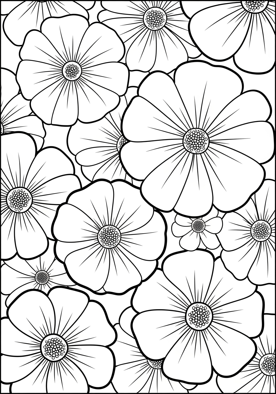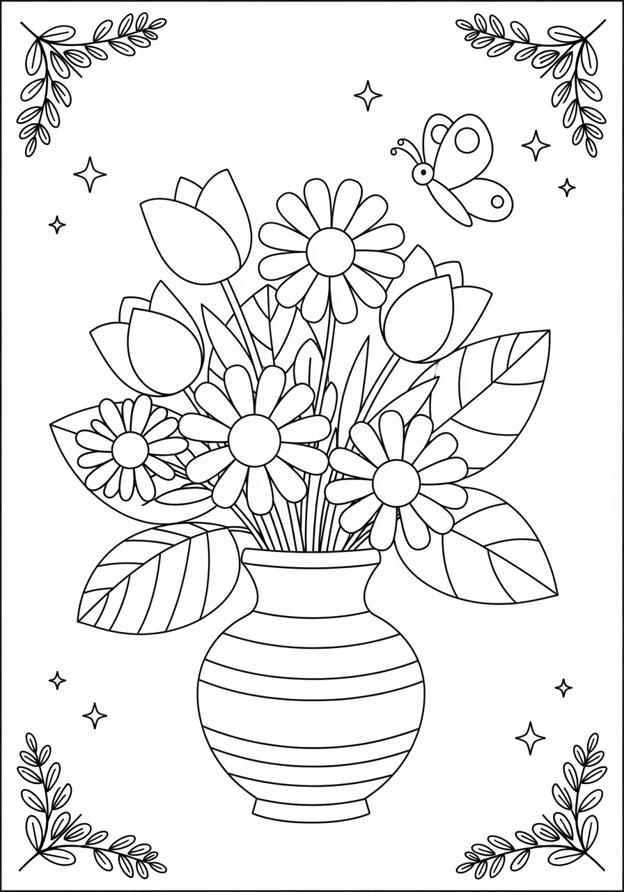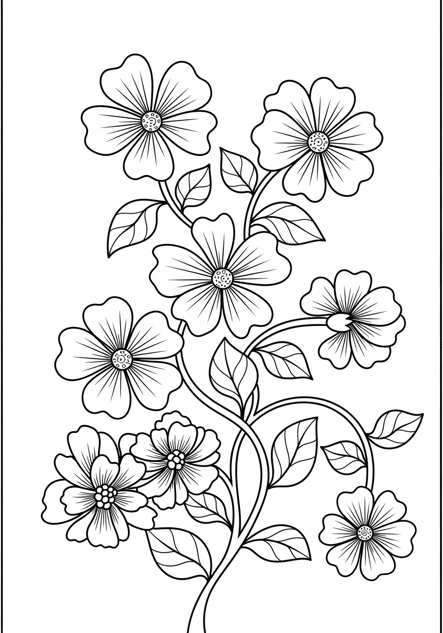 Introduce your child to the enchanting world of coloring with our "Enchanted Floral Wonderland" page inspired by Johanna Basford's renowned style. This line art illustration invites young artists to explore a magical garden scene, featuring a prominent daisy with large, patterned petals at its heart. Surrounding this centerpiece, five graceful bellflowers hang from winding vines, creating an inviting composition. The page is bordered by swirling patterns that incorporate small buds and leaves, adding a decorative touch. With clusters of uniquely veined leaves and butterflies with symmetrical wing designs gracefully fluttering around, every element is crafted to encourage creativity and develop fine motor skills. Perfect for a classroom setting, home crafts, or mindfulness activities, this coloring page not only provides hours of entertainment but also fosters relaxation and patience. Parents and educators will appreciate how this Johanna Basford-inspired page offers a joyful and imaginative experience, making it an excellent choice for printable downloads. Immerse your child in a world where art and nature come together, celebrating a sense of accomplishment and creativity.