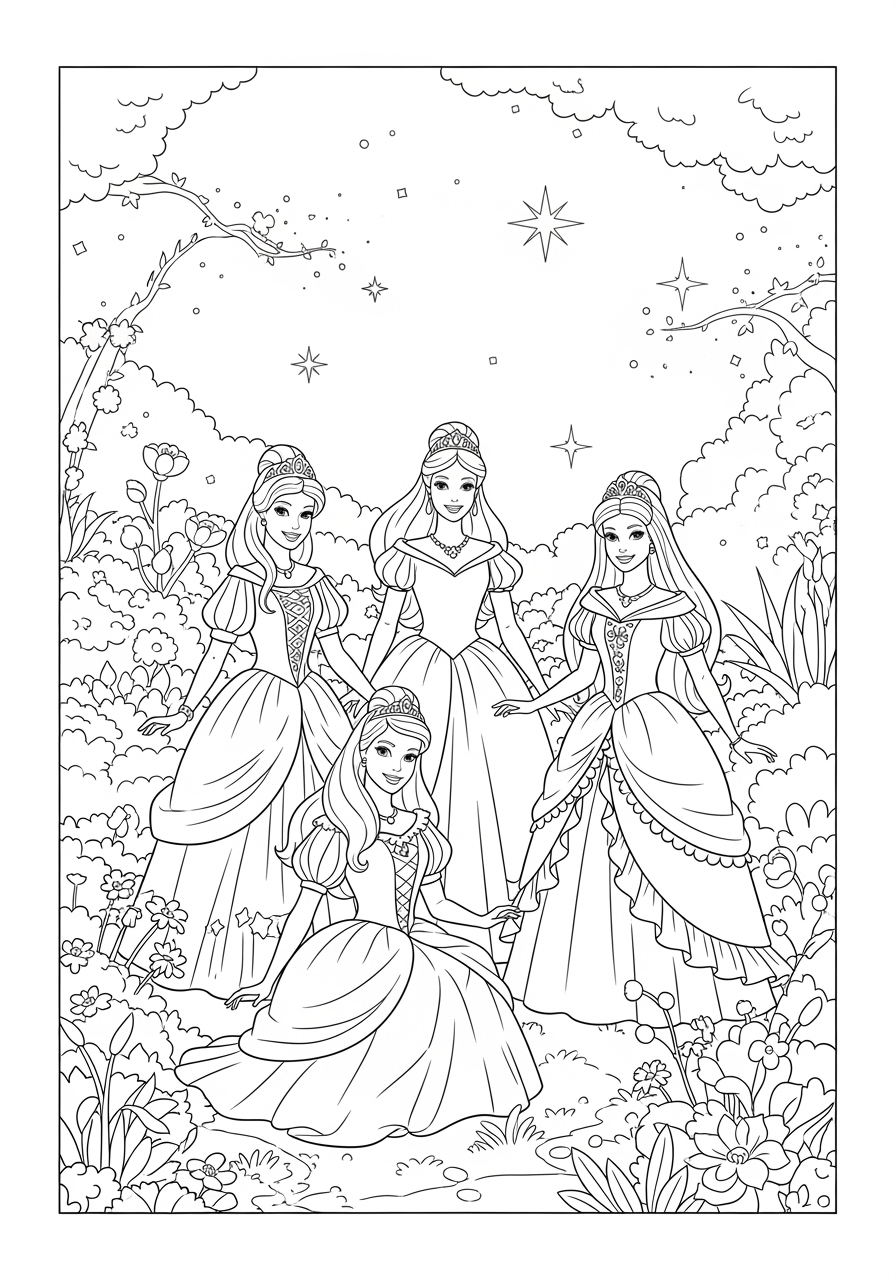 Dive into a world of imagination with our beautiful Barbie princess coloring pages. This enchanting page showcases a joyful princess seated elegantly amidst an enchanted garden. With her flowing hair, adorned ball gown, and sparkling tiara, she's a delight to color. The high-contrast line art is designed with bold outlines and simple shapes, making it perfect for children to explore their creativity. As kids color, they'll improve their fine motor skills and patience. This page is ideal for home crafts, classroom activities, or a calming travel companion. The garden background, complete with clusters of roses, delicate butterflies, and a curved stone bench, adds to the fairy-tale magic. Encourage joy and a sense of accomplishment as young artists bring this scene to life. Download this printable page for a bonding and relaxing activity that sparks creativity and imagination.