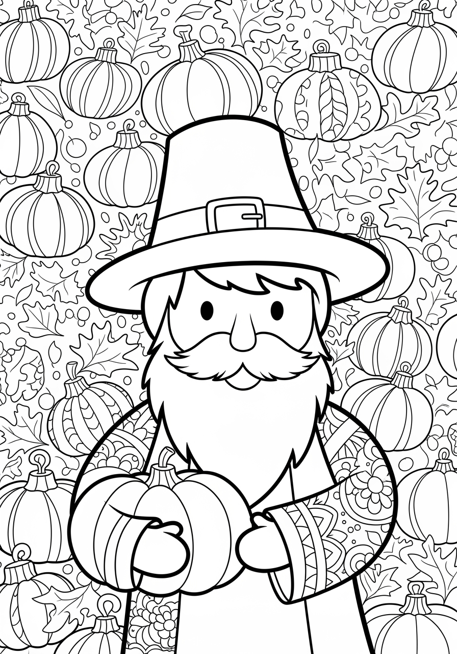 Celebrate the joy and warmth of Thanksgiving with our delightful turkey day coloring pages printable. This beautifully crafted page features a proud turkey with a stunning display of tail feathers as its centerpiece, ready to capture the imagination of young artists. Surrounding the turkey are small and medium-sized pumpkins, creating an inviting autumnal atmosphere. To the side, a bountiful cornucopia overflows with seasonal fruits and vegetables, including grapes, corn, and squash, symbolizing abundance and gratitude. Floating leaves add an extra touch of fall magic to the scene. Perfect for classrooms, home activities, or even travel, this coloring page encourages creativity and helps develop fine motor skills. Children will enjoy the simplicity of the large shapes and bold outlines, making it easier for them to color with confidence. This printable page offers a wonderful opportunity for family bonding, relaxation, and fostering a sense of accomplishment in young minds. Download now and let the festive spirit of Thanksgiving bring joy and imagination to your child's coloring experience.