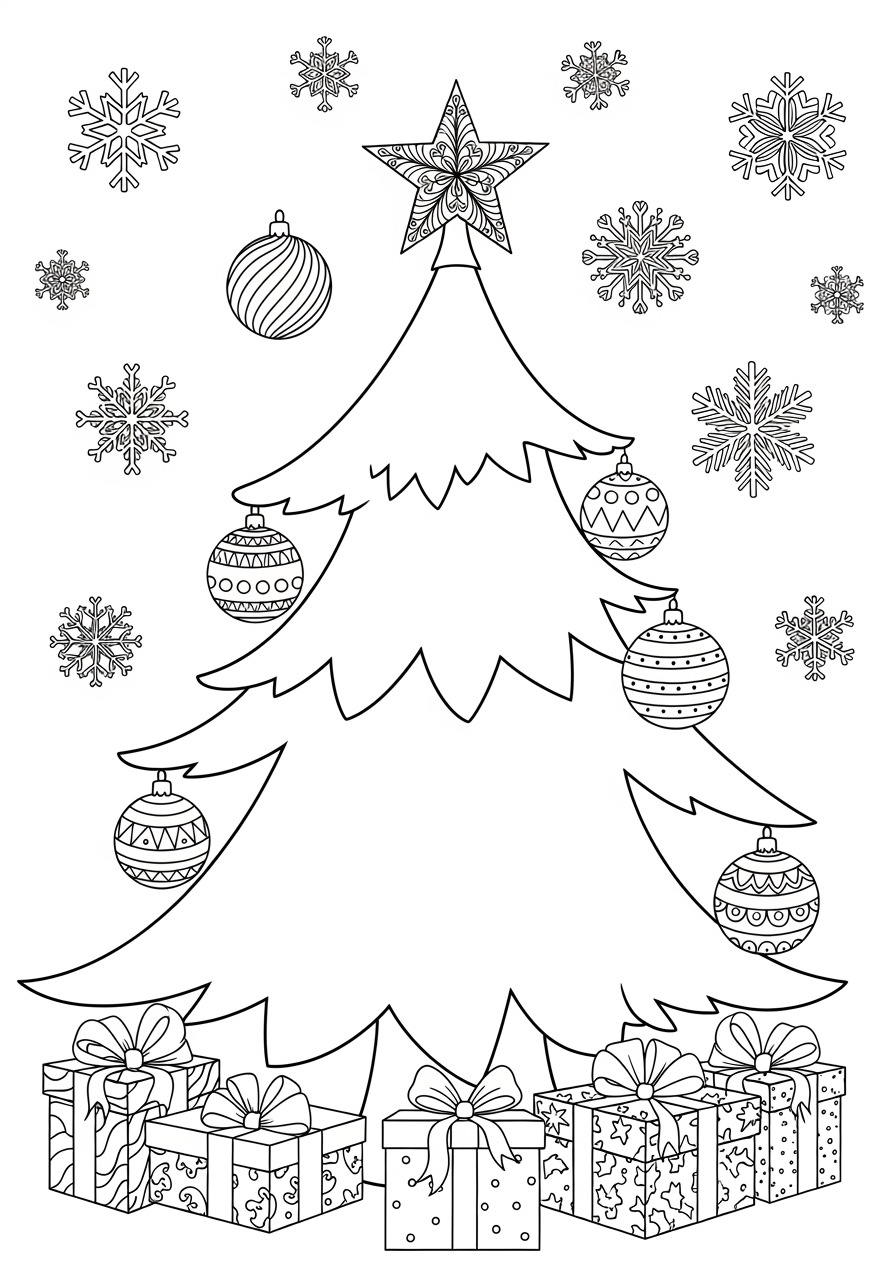 Introduce your child to the enchanting world of a "Christmas Princess Coloring Page," where creativity meets festive joy. This delightful coloring page features a graceful princess adorned in a winter-themed gown, complete with snowflake patterns and fur trims. She holds a star ornament, perfectly capturing the spirit of Christmas. The scene is complemented by a beautifully decorated Christmas tree, complete with tinsel, baubles, and a shining star on top, surrounded by an array of wrapped gifts. Snowflakes gently fall throughout the illustration, creating a magical winter ambiance.