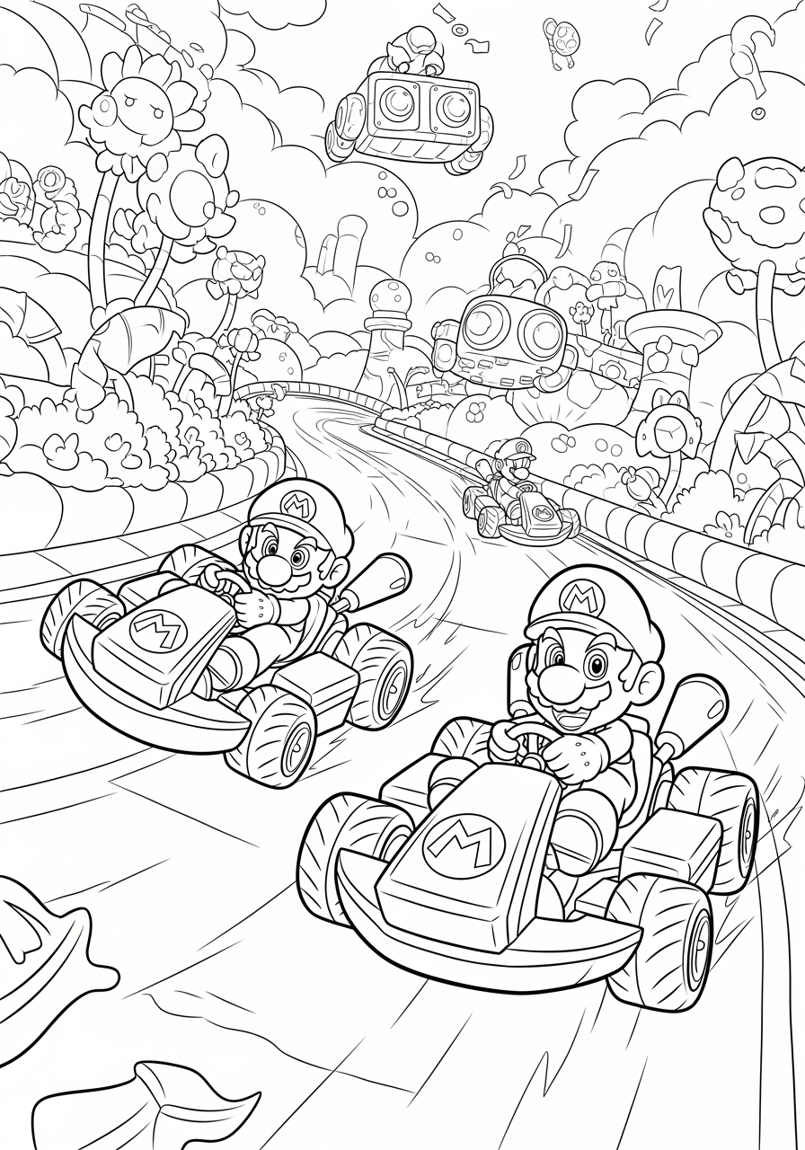 Introduce your child to the exhilarating world of kart racing with this engaging Mario Kart character coloring page. Perfect for home crafts or classroom activities, this printable coloring page offers a dynamic scene featuring two beloved characters racing side by side on a whimsical track. The bold outlines and large, simple shapes make it easy for young artists to color, promoting creativity and enhancing fine motor skills. The fantastical scenery, with oversized plants and magical obstacles, will captivate children's imaginations, providing a fun and relaxing activity that encourages patience and focus. Whether used for travel entertainment or a therapeutic mindfulness exercise, this coloring page is sure to bring joy and a sense of accomplishment. Download this delightful Mario Kart character coloring page today and let your child's creativity race ahead!