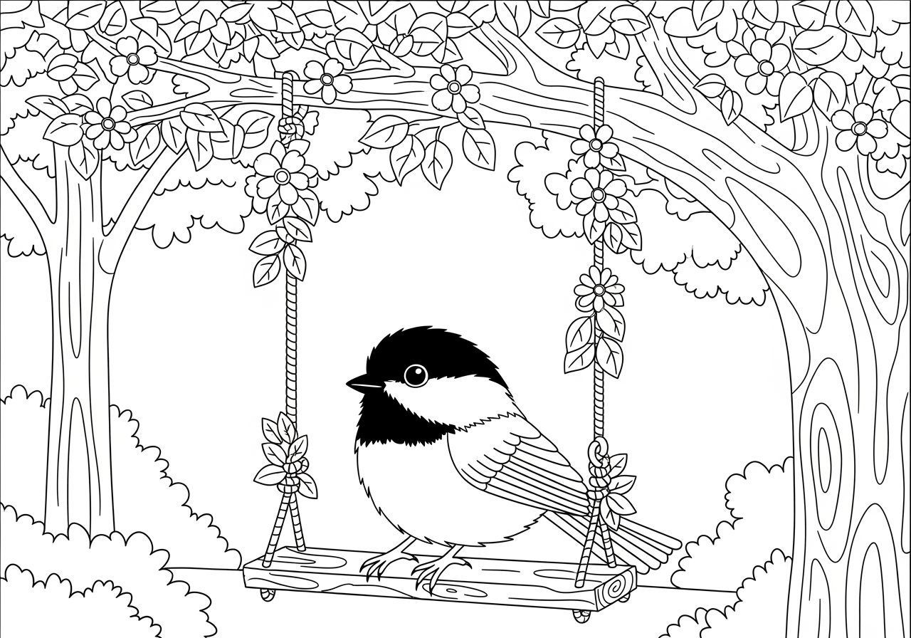 Chickadee on a Tree Swing Coloring Page